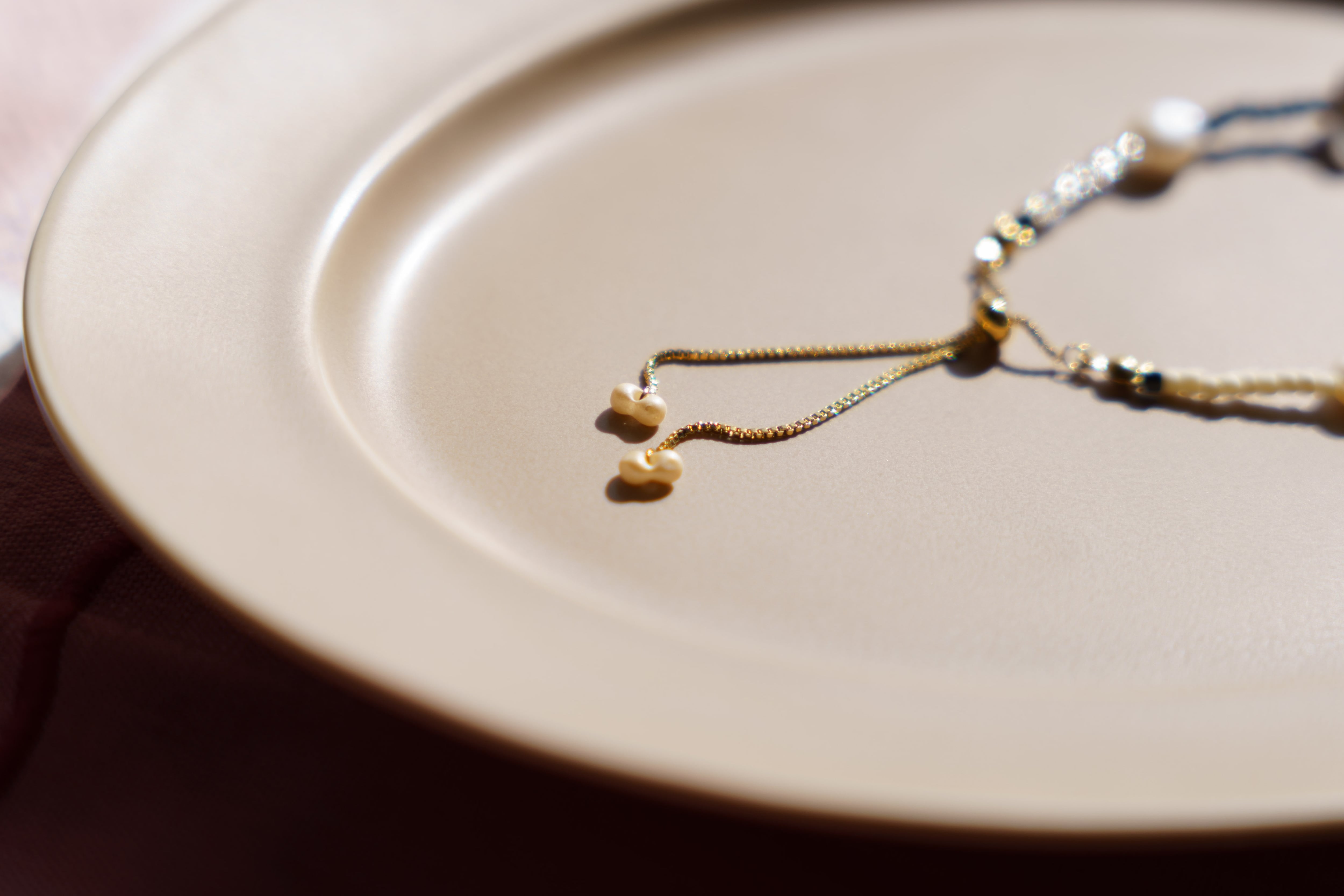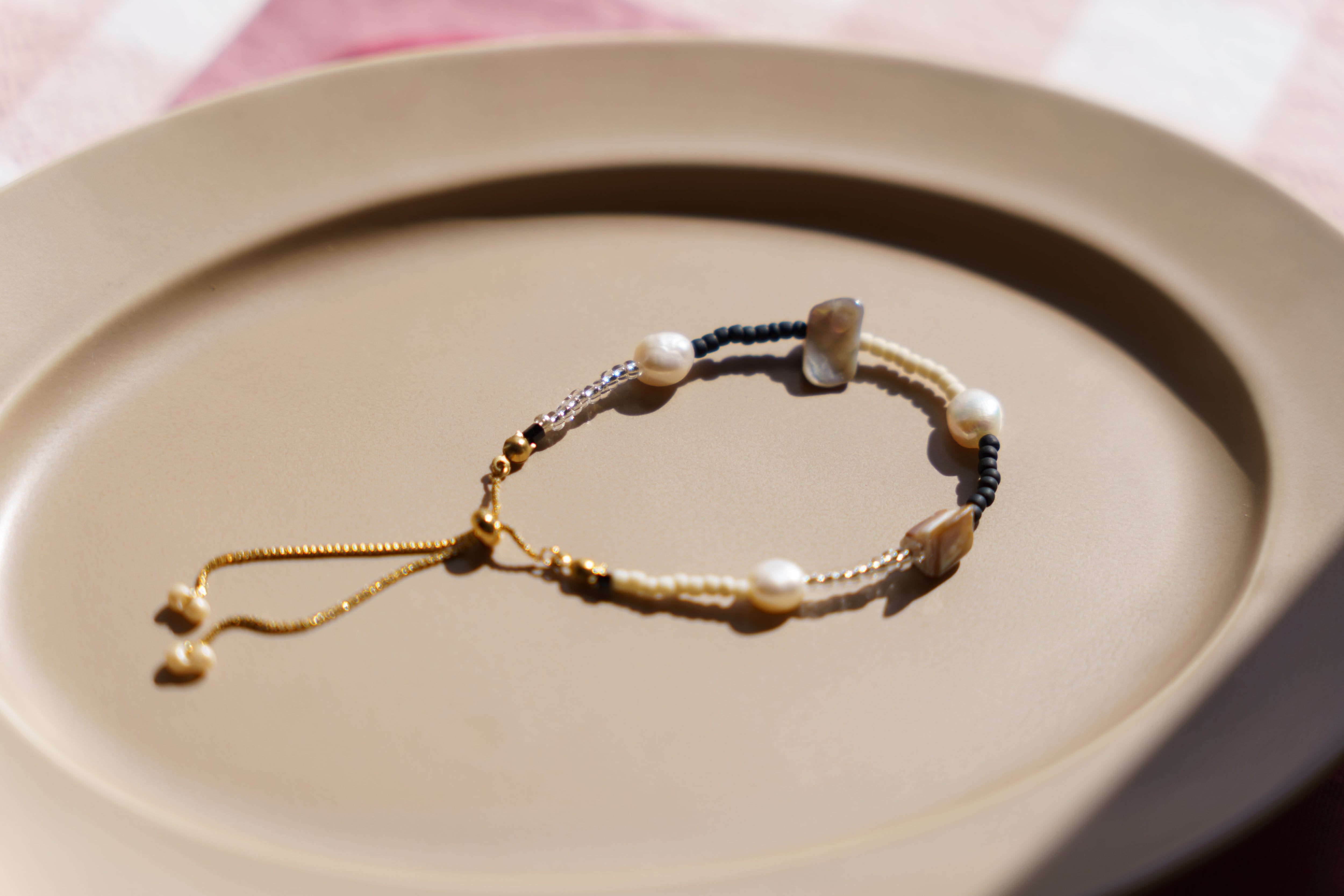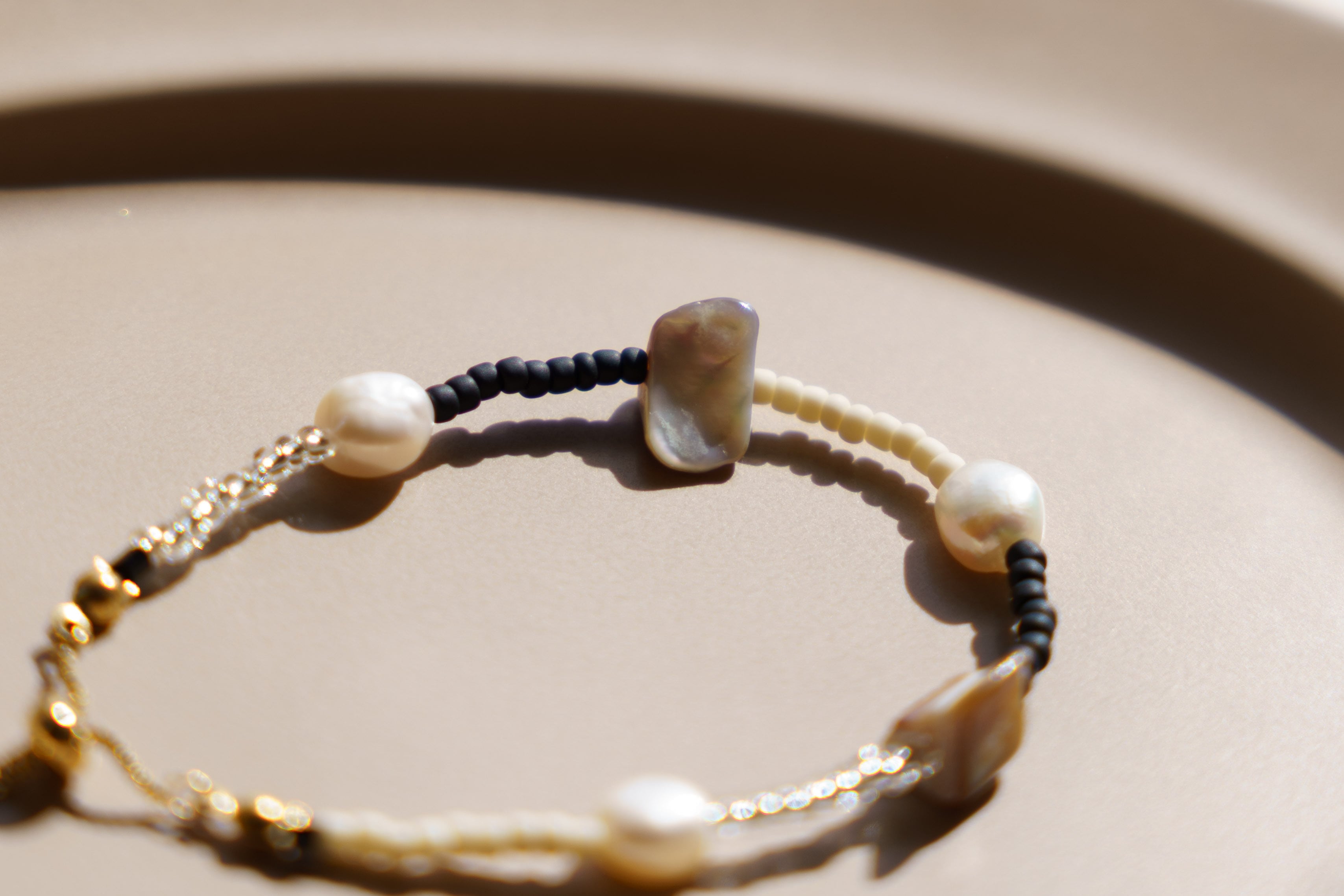 淡水パールと天然シェル、上品なビーズで仕上げたブレスレット