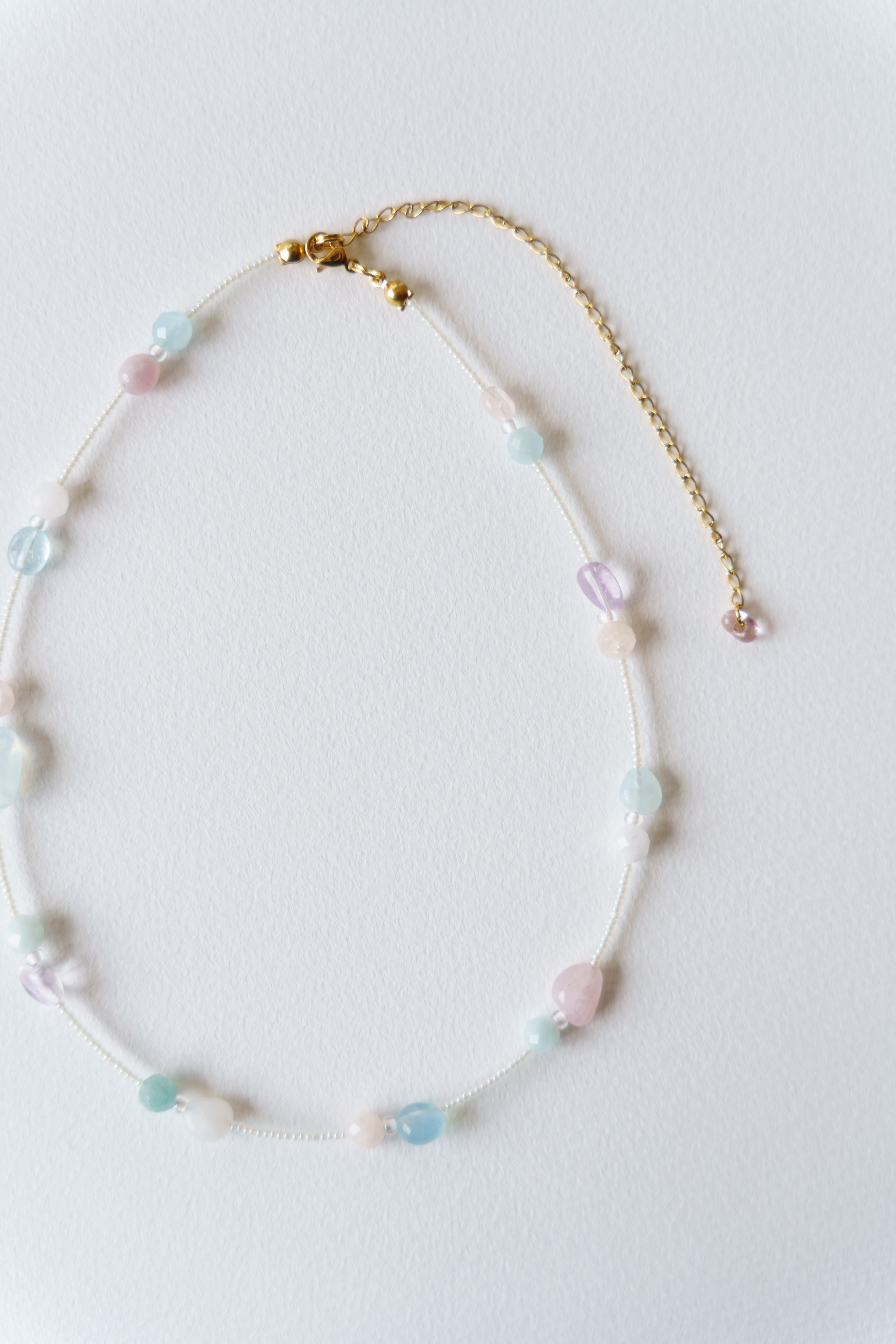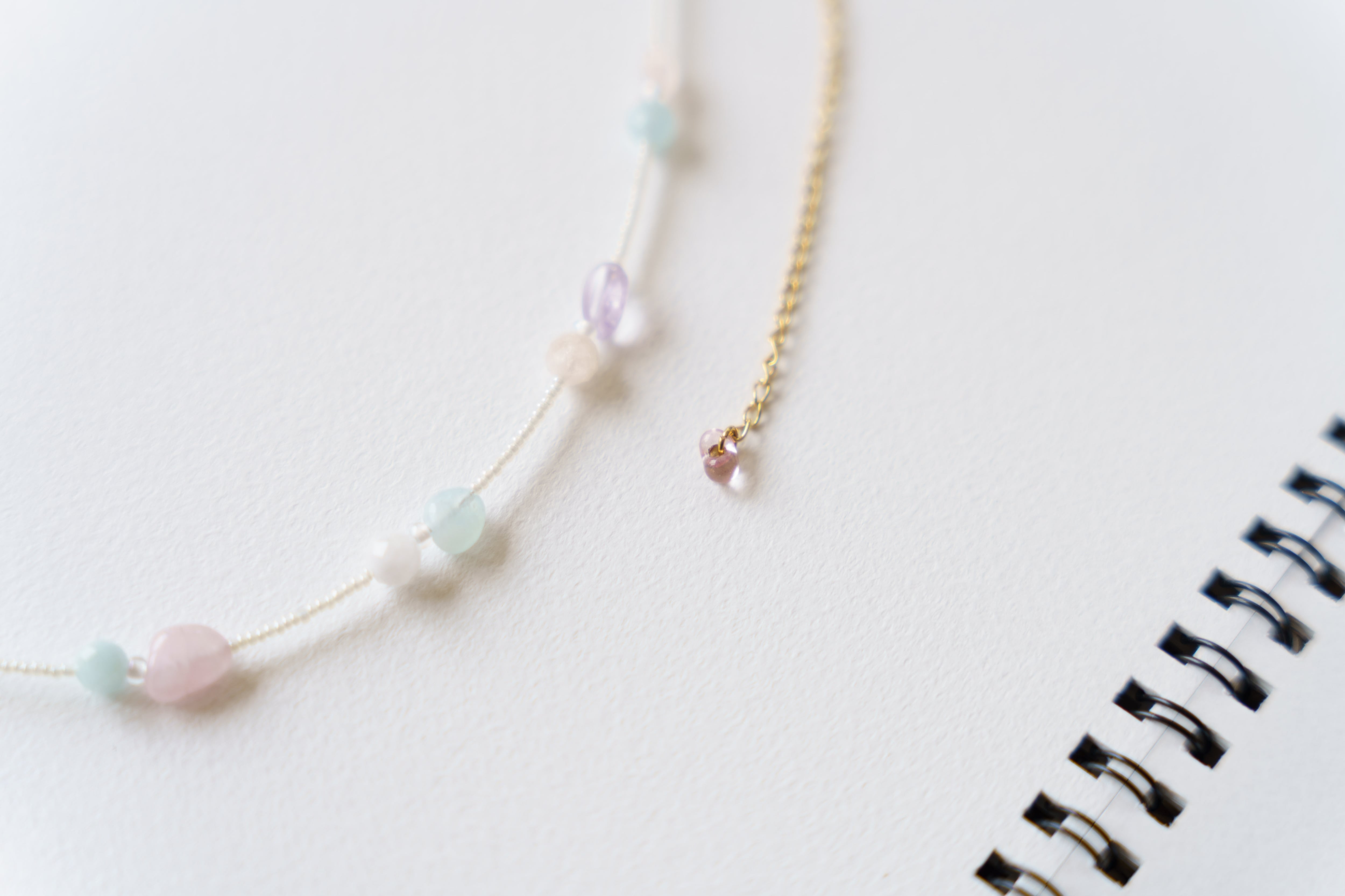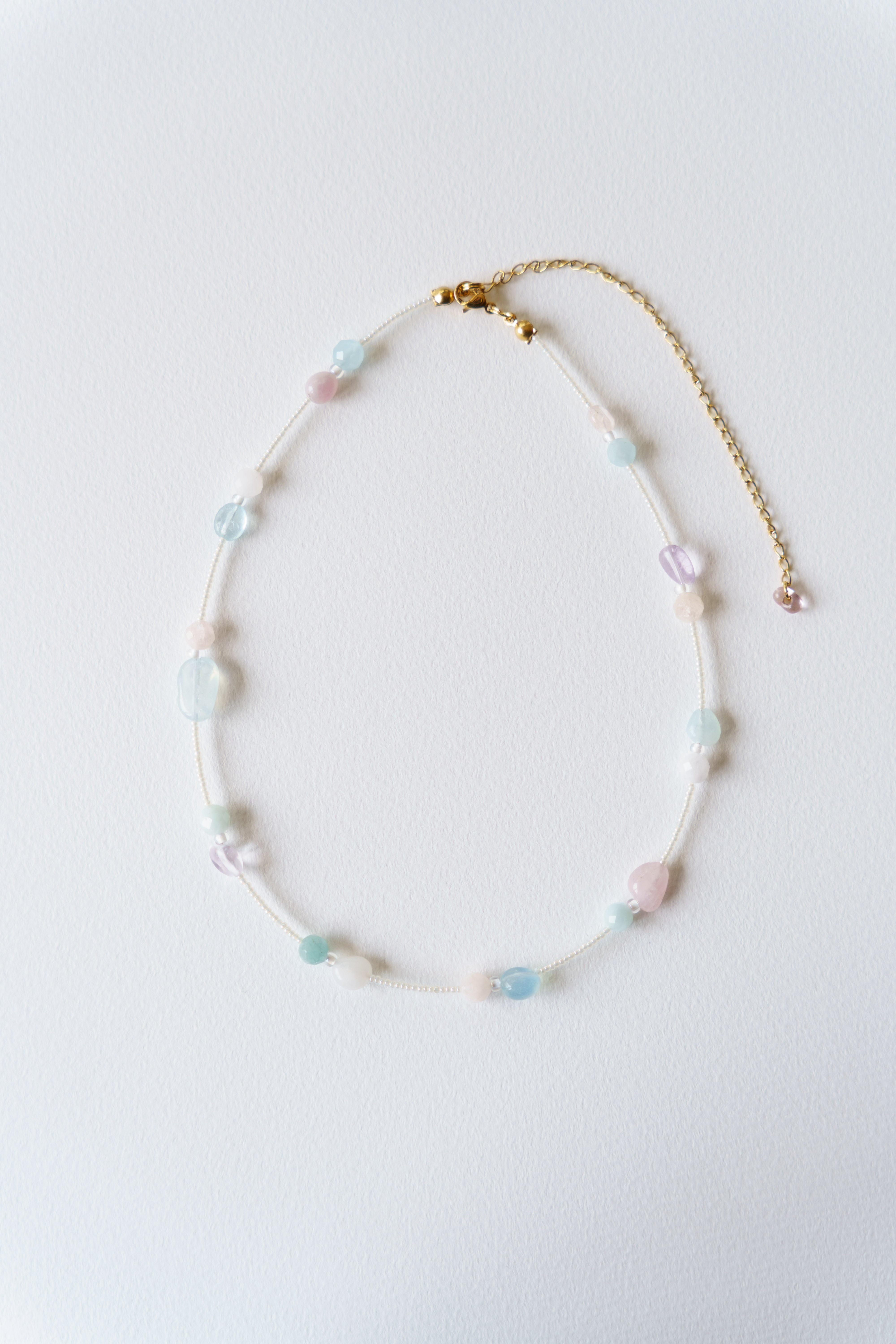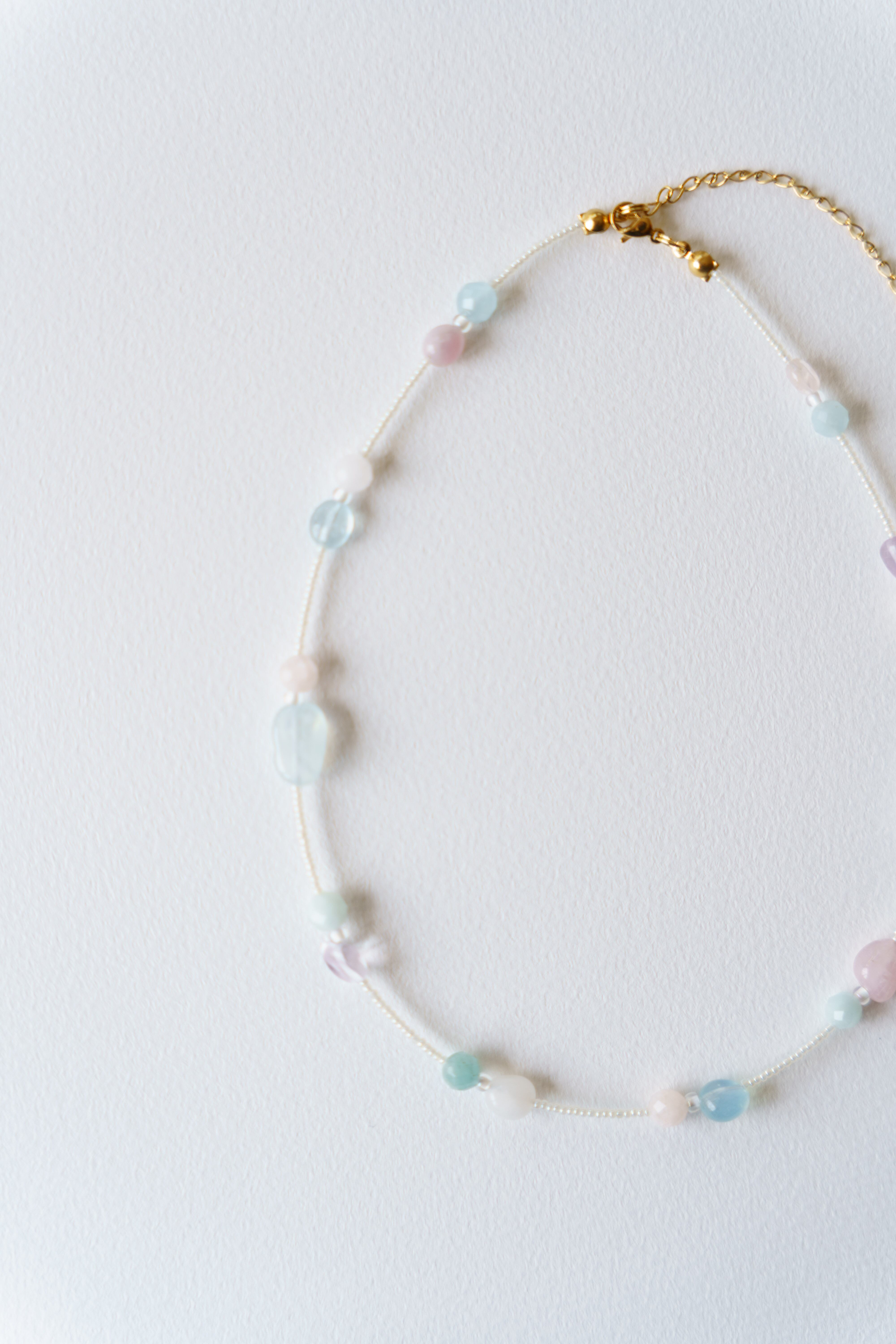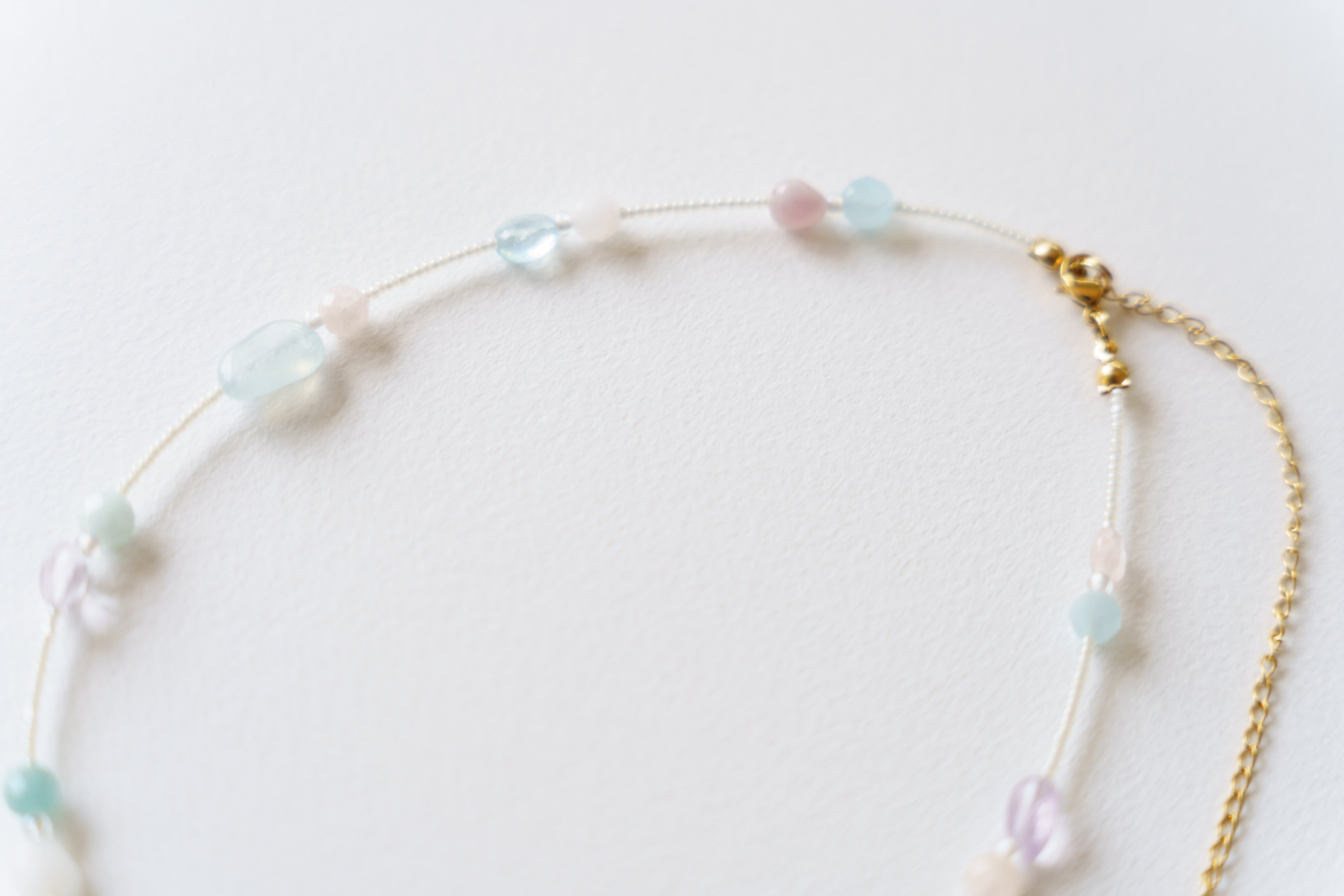 — 水面下の残り火 — やり残したかのように 道に迷ったかのように 表にはそう見えて 内なるものを育んでいる 【ミックスベリル×天然石ミックス】 可能性、癒し、浄化、自己愛 「心を優しく整えながら、自分らしさや幸せを引き寄せる」 材質:ミックスベリル、ラベンダーアメジスト、ローズクォーツ(天然素材の為形に個性があります)、ビーズ、サージカルステンレス サイズ:全長約37cm+10cmアジャスター