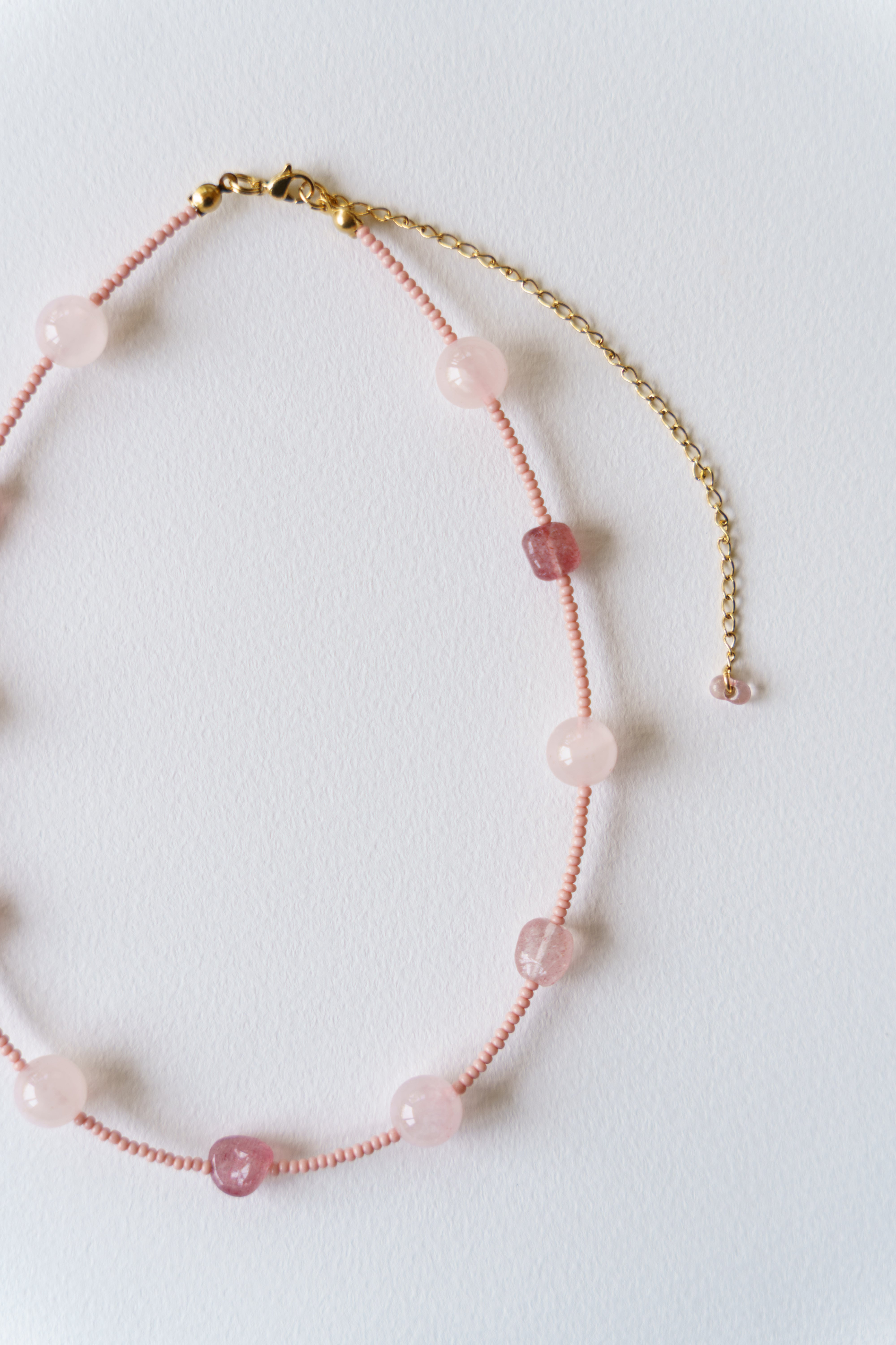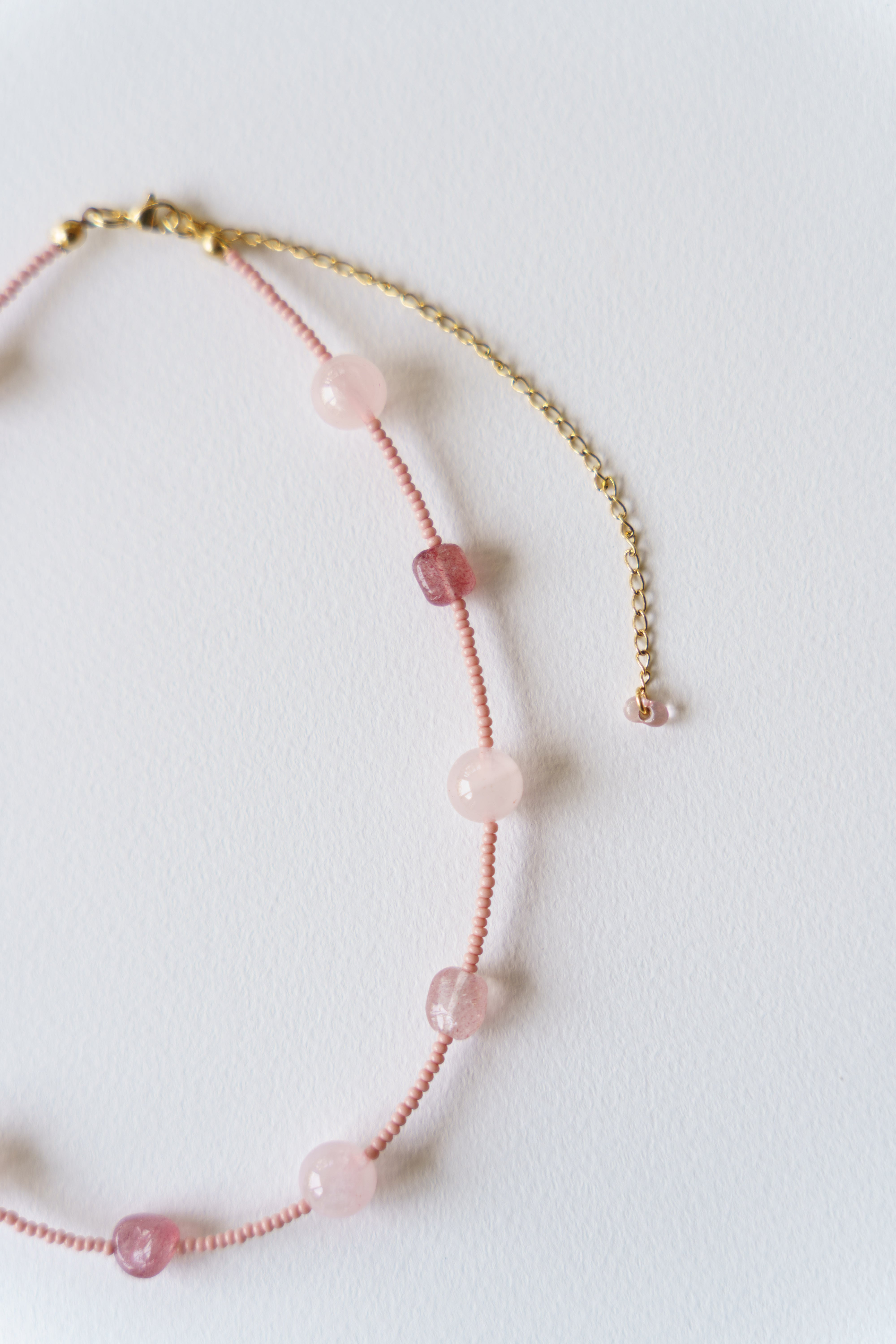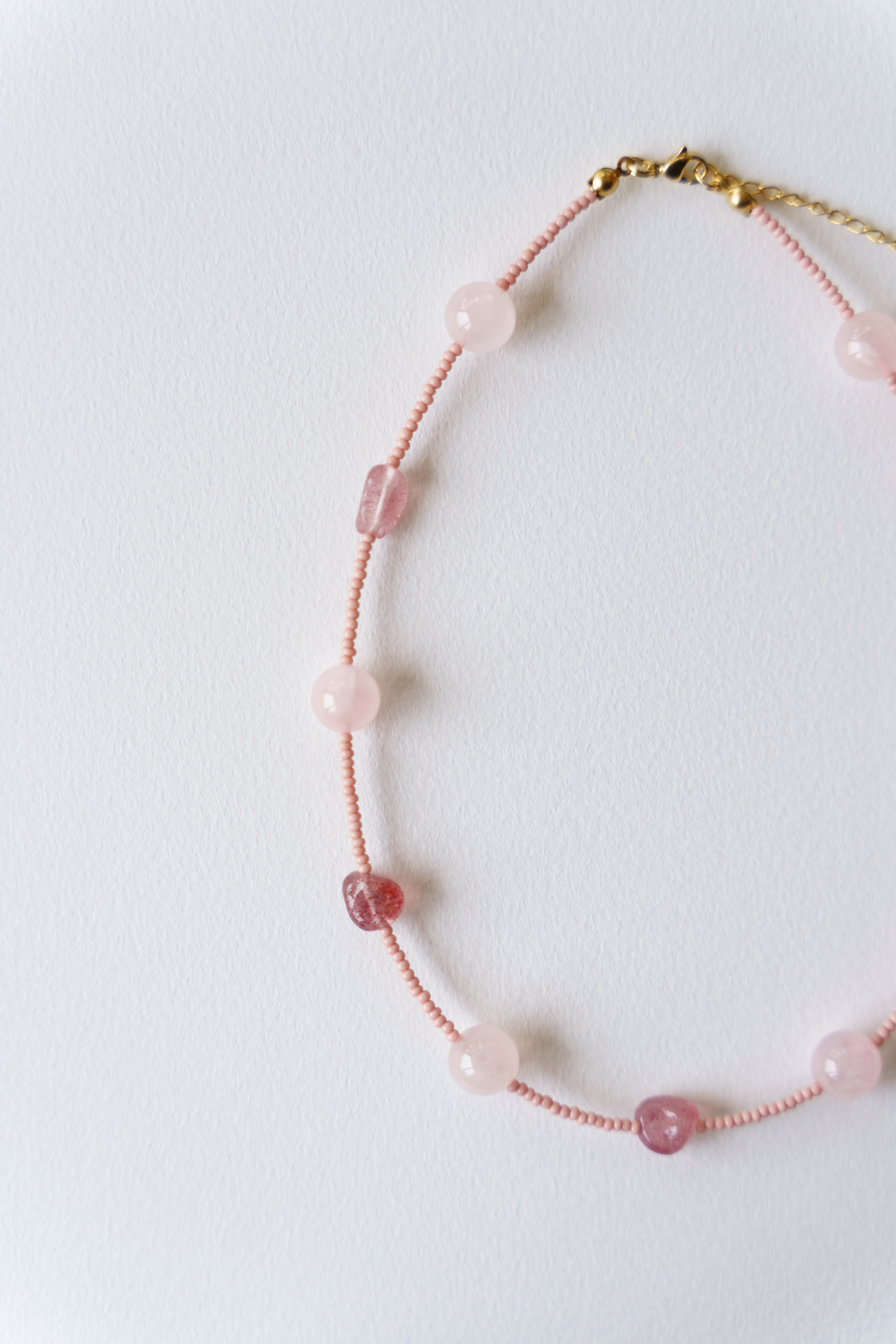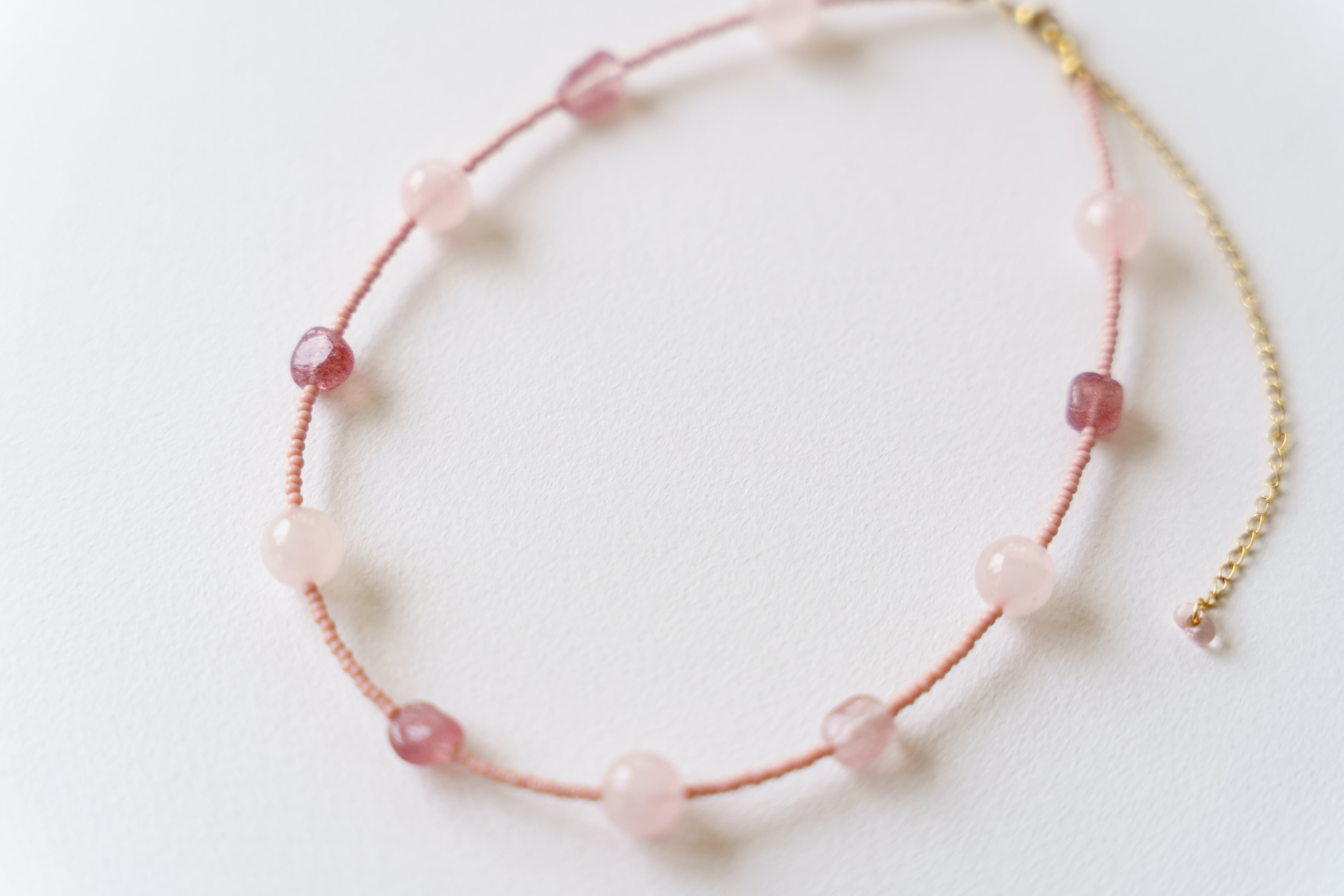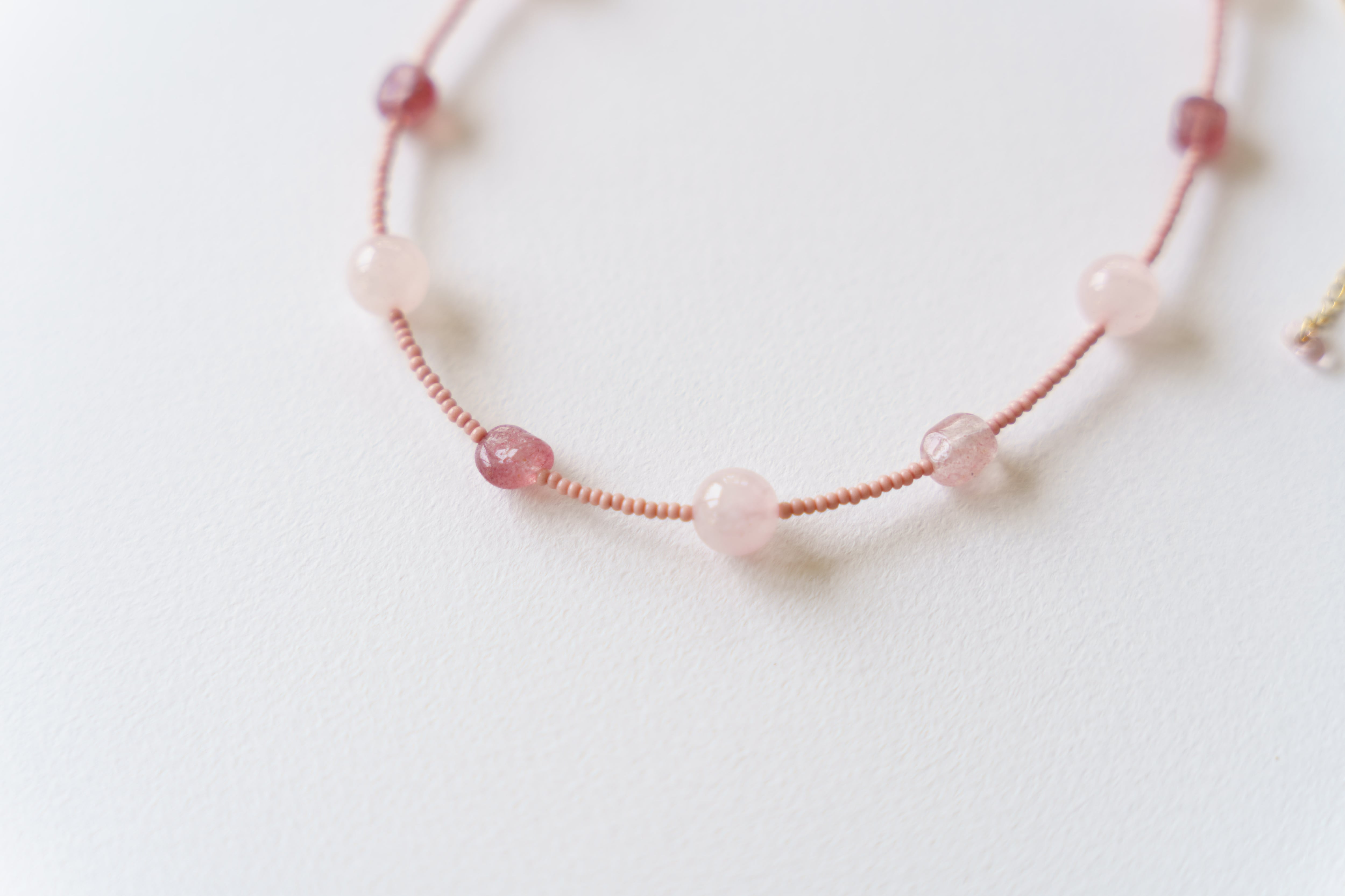 材質:ローズクォーツ、ストロベリークォーツ(天然素材の為形に個性があります)、ビーズ、サージカルステンレス